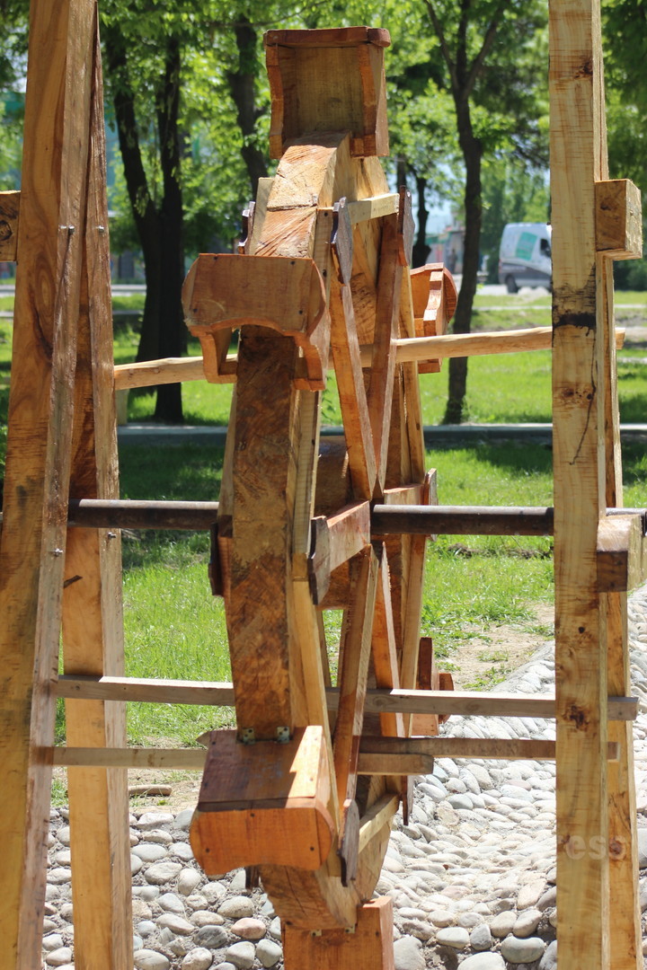 The woodworkers and employees of Bishkekzelekhoz created designs from wood in ethno theme for 3 months. 3 wood komuzs, watermill, swings, benches and pine bridges were installed in the park. In addition, the employees laid path from river rocks across the park’s territory.