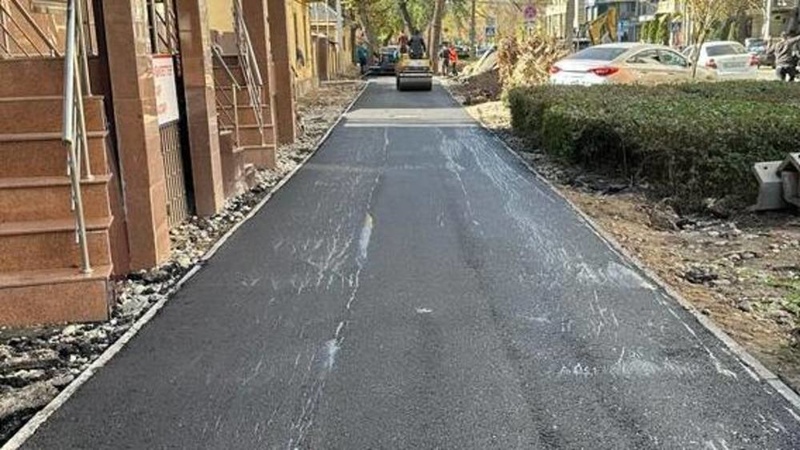 Sidewalk on Bokonbaev street undergoes upgraded asphalt repaving with machinery